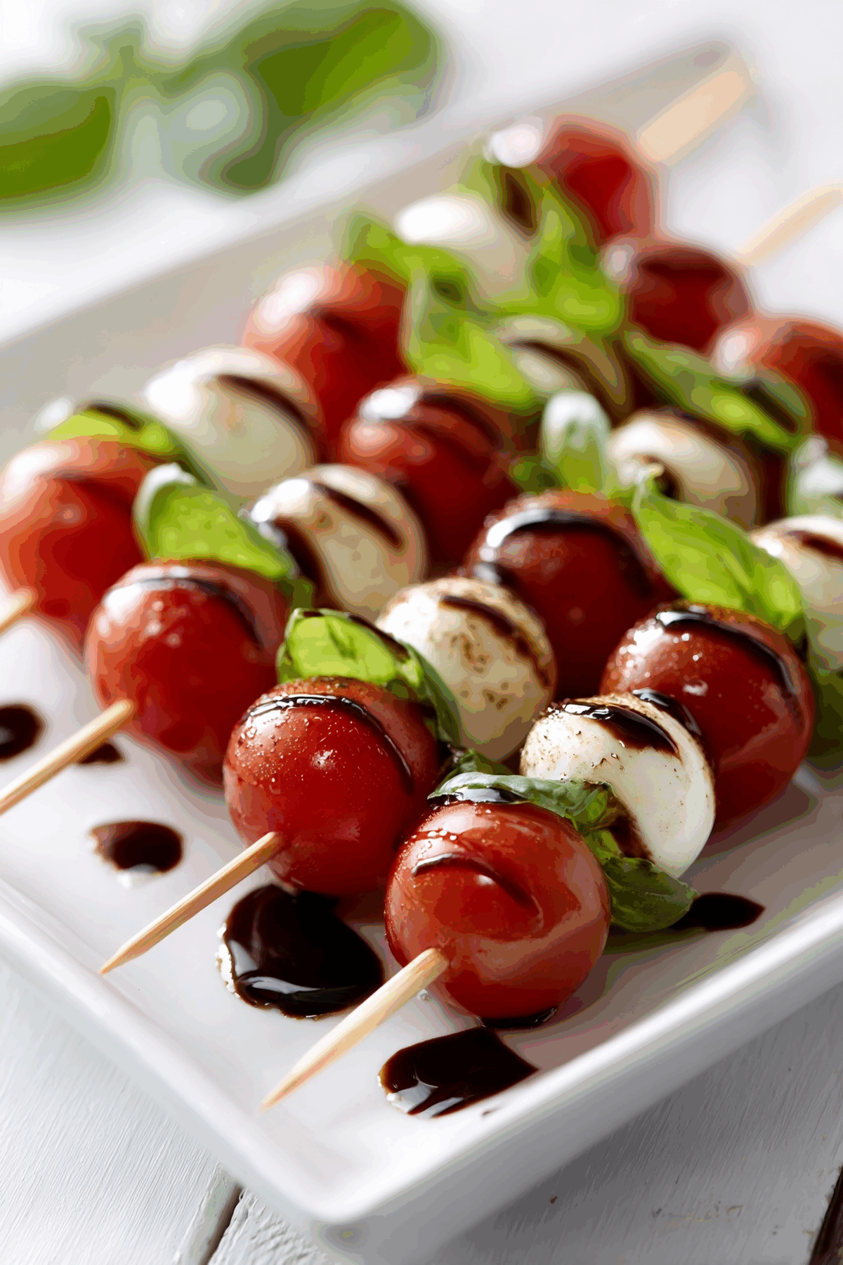 Tip: Add a tiny basil leaf at both ends of each skewer to prevent sliding and keep herbs from wilting against the cheese.