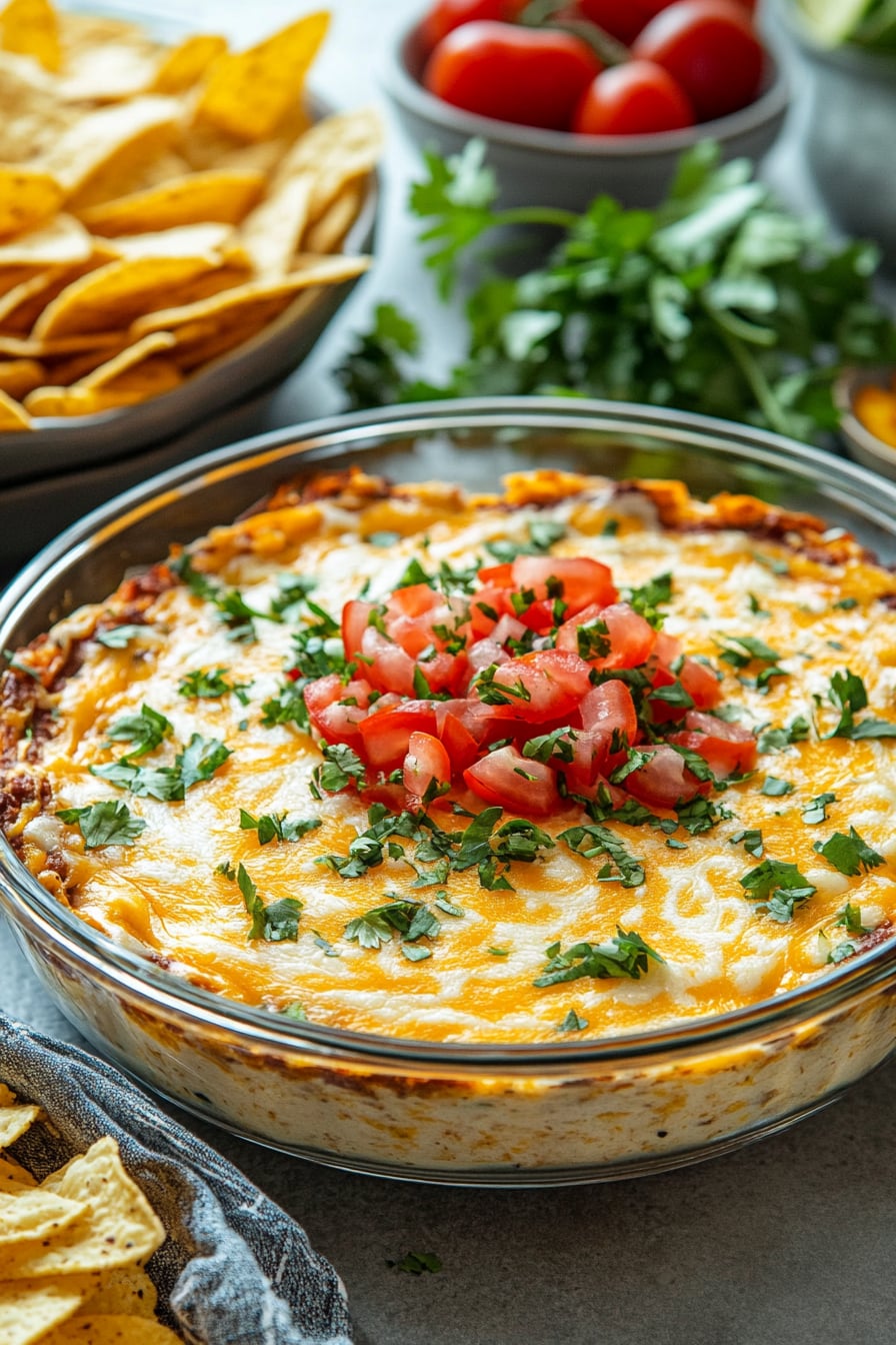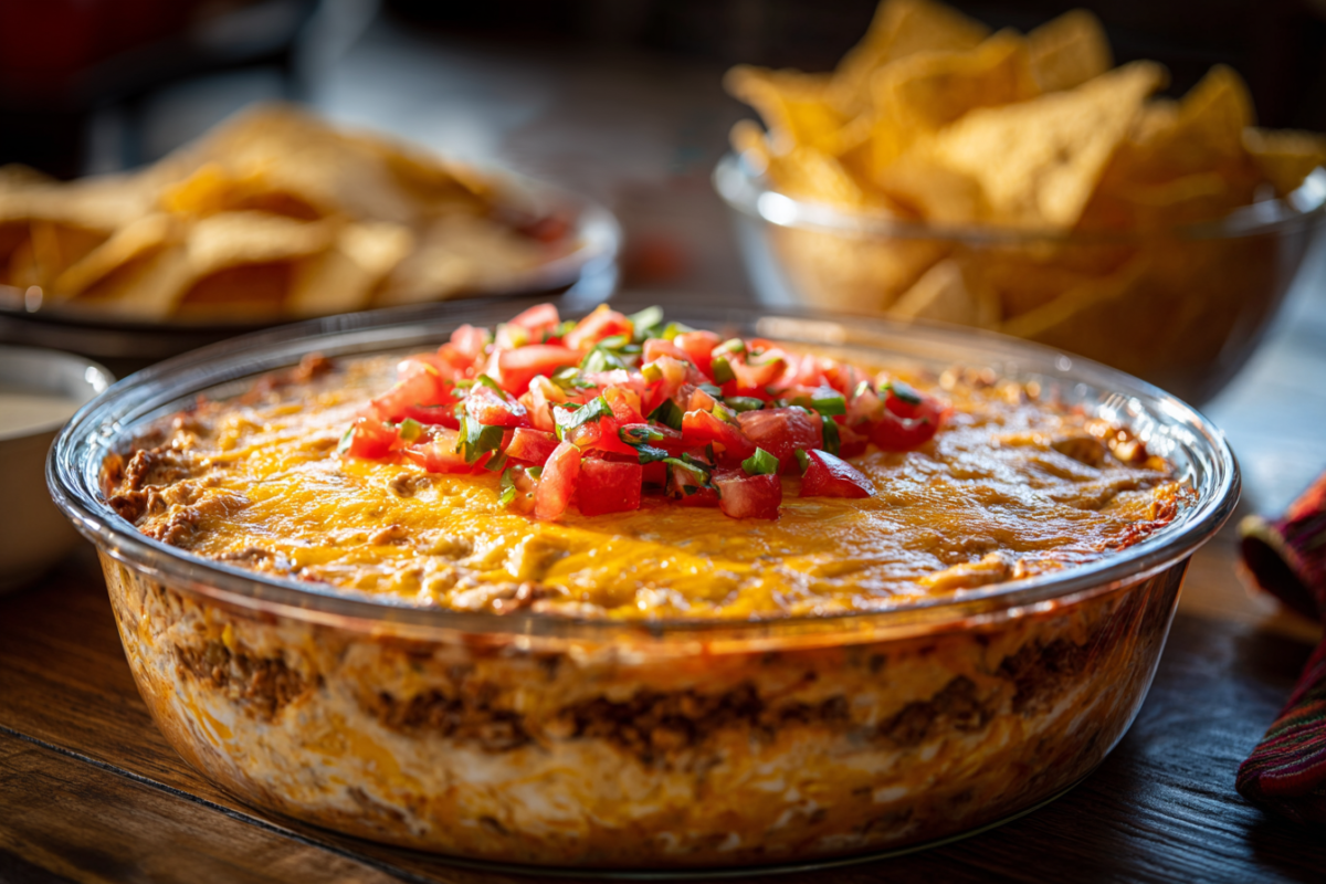 When I make this dip for a party, I focus on two small steps that make it better. I reduce the beef until it’s dry and glossy, then drain and blot the toppings so they don’t water down the dip.