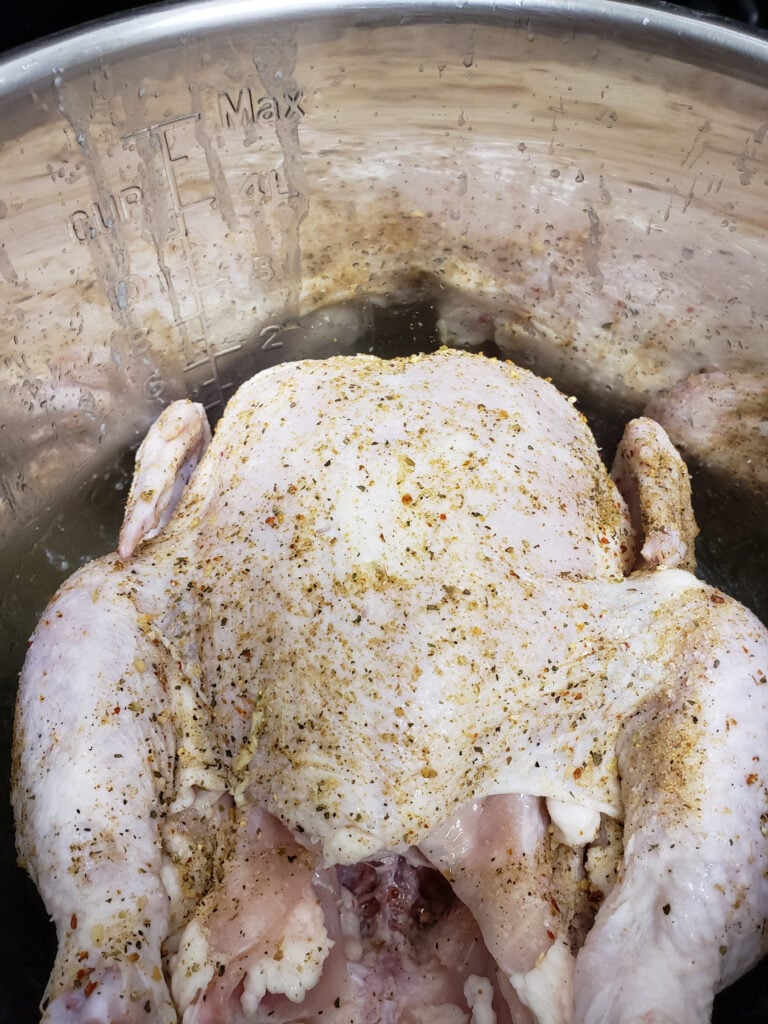 - Whole Chicken: A 3-pound chicken (approximately) works well. Any much larger chicken will be difficult to brown and will not fit well in the Instant Pot.