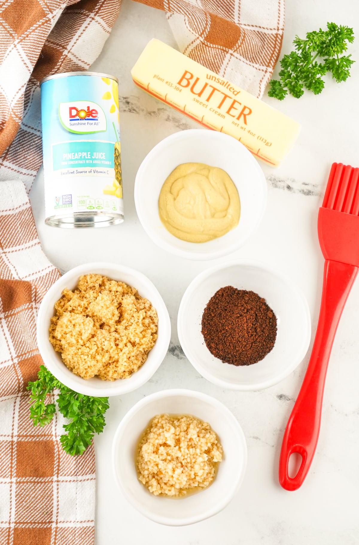 - In a medium bowl, whisk together brown sugar, pineapple juice, Dijon mustard, cinnamon, and cloves.