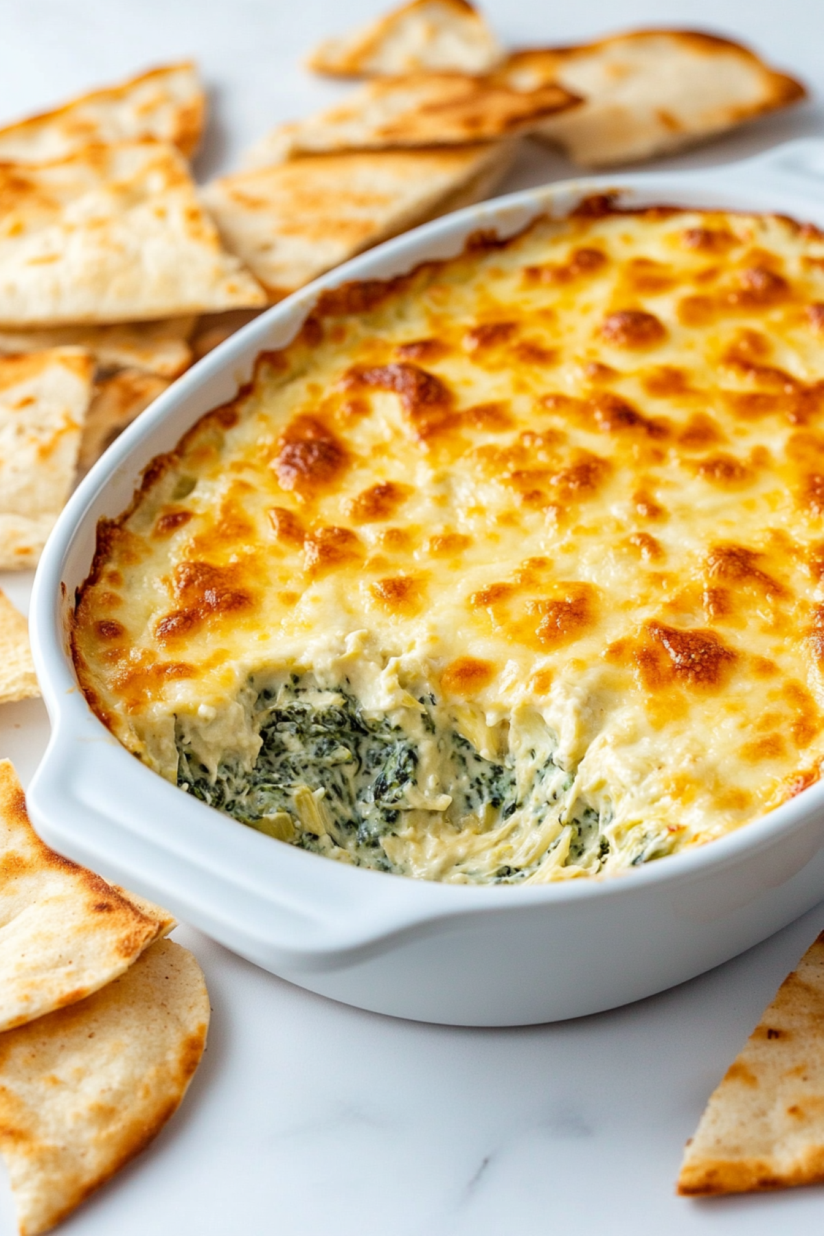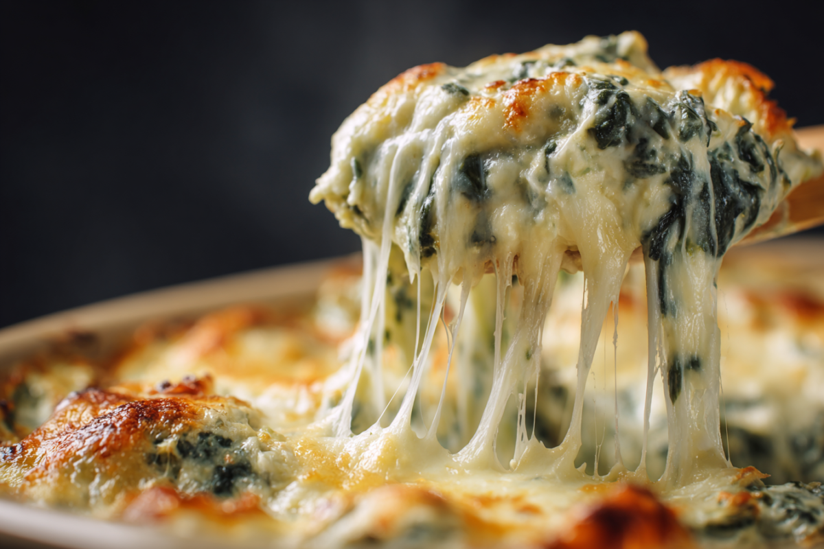 ➤ How to make it: Mix the creamy base until smooth, then fold in spinach, artichokes, cheese, and seasoning. Bake at 400°F covered until hot and bubbly, then rest a few minutes so it thickens.